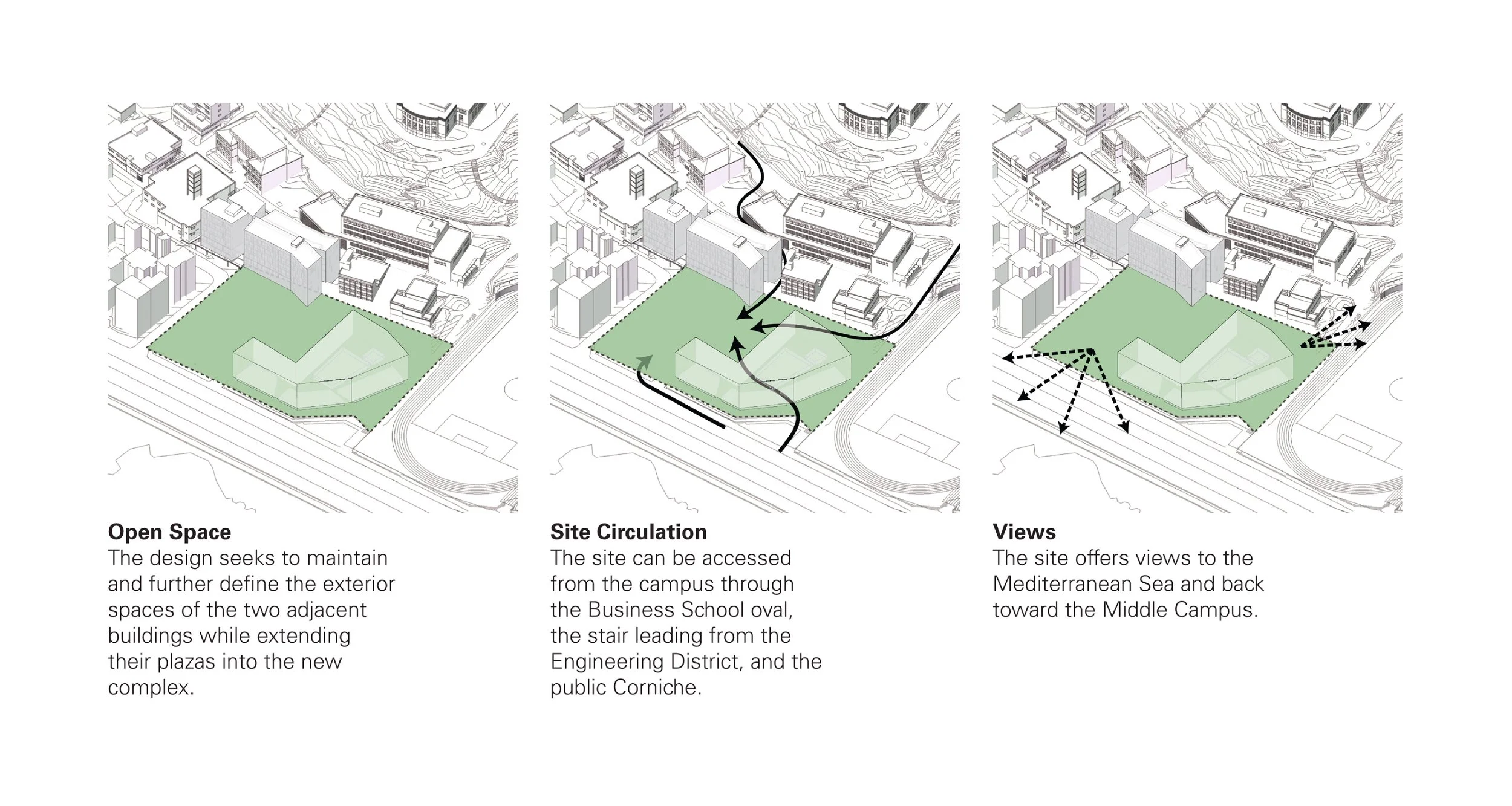 The concept planning study looked at the consolidation of disparately located graduate research centers and the fine arts program into a highly visible and accessible campus center for the arts and humanities. VJAA completed a detailed space program and studied a range of options of how to fit the area requirements and appropriate site development within the proposed new facility zone. The Master Plan addressed programming, site and building planning, and massing strategies. Based on the University’s goals, VJAA proposed a range of strategies that prioritized increased integration, collaboration, and flexibility. The proposed 145,000 SF, three-building complex is organized to facilitate interaction and social encounters while making visible the many creative activities that take place in the Center. Spaces within the complex include exhibition galleries, collections storage, studios, classrooms, a conference center, and a large theater. The planning study reflects the University’s commitment to the ideals of critical thinking and openness while also serving their needs for safety and security. The study also addressed the need for highly visible, landmark buildings as well as the campus’ need for new community gathering spaces.